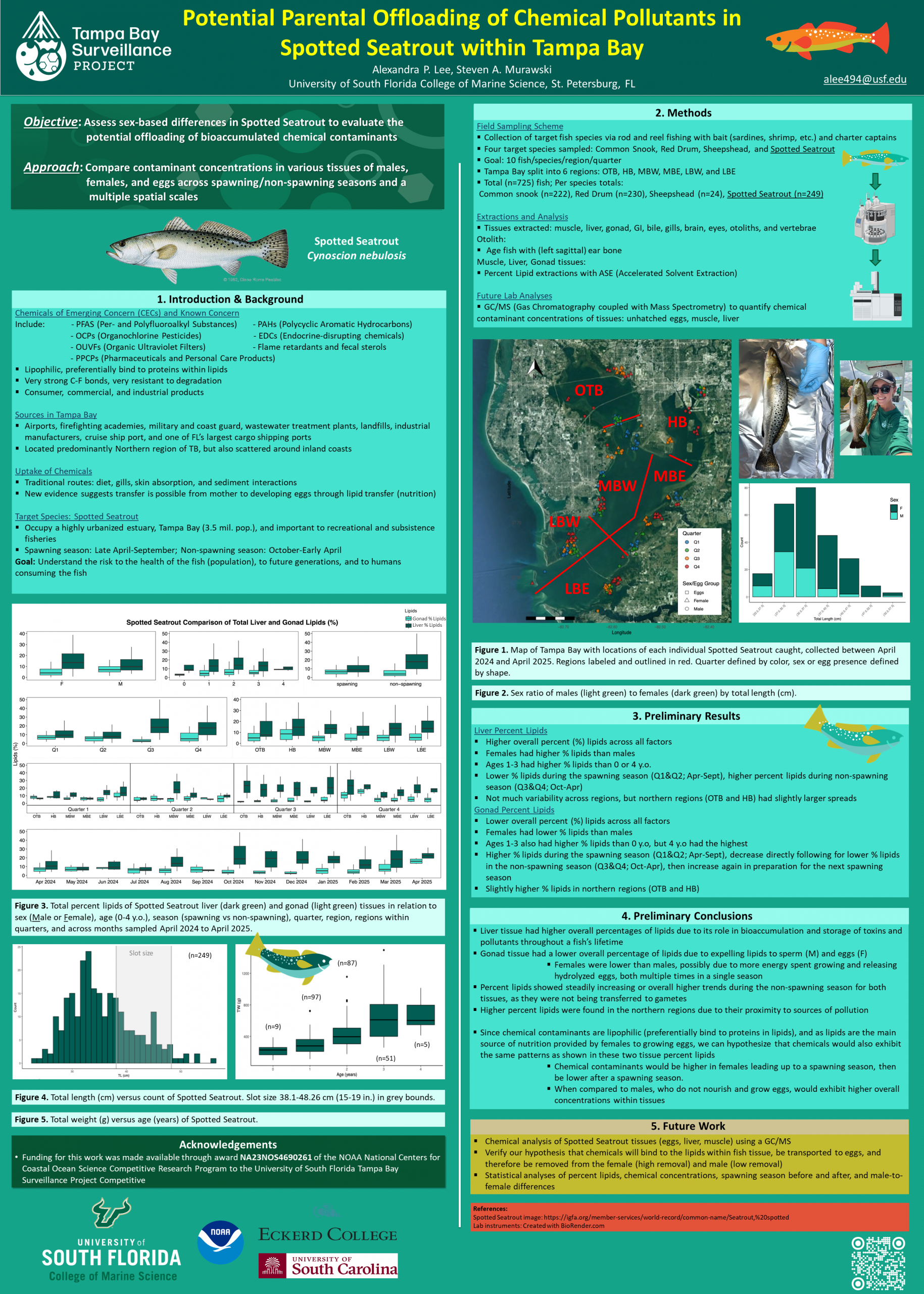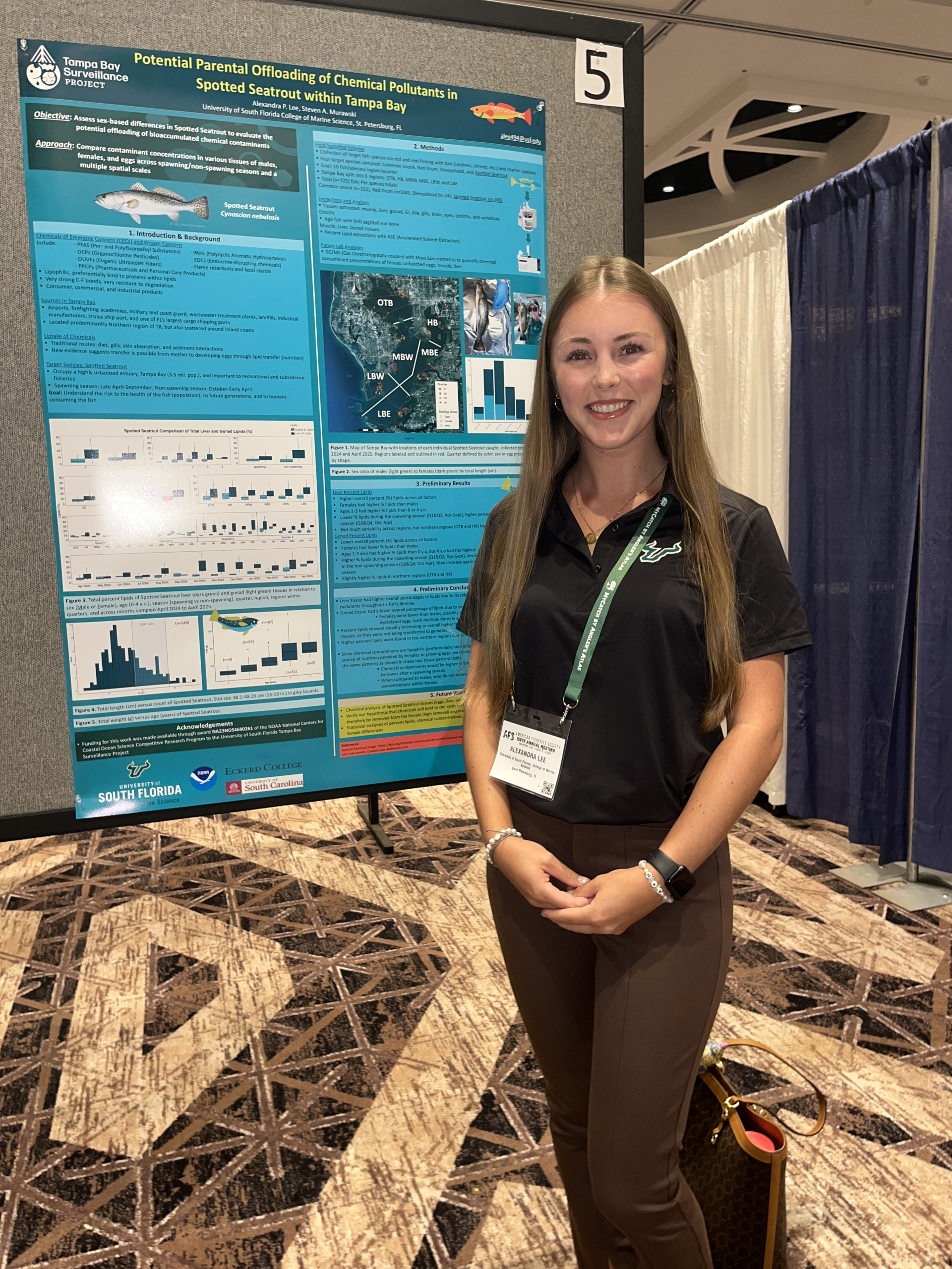 Alexandra presented a poster on her current master’s thesis work, “Potential Parental Offloading of Chemical Pollutants in Spotted Seatrout within Tampa Bay, FL,” which won the award for best student poster in the Water Quality Section (WQS), also earning Alexandra an invitation to be a member of AFS’s WQS sub-group. In the poster, Alexandra presented evidence for initial correlations between lipids and pollutants within fish tissues.